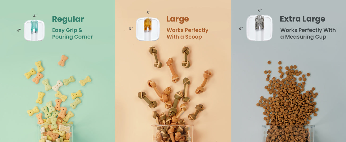 The Felli Flip-Tite container comes in a variety of sizes and shapes to meet different food storage needs. The 4" REGULAR and RECTANGULAR sizes are perfect for organizing small kitchen counters and pantries, making handling and pouring easy. The 5" LARGE size is ideal for storing items like sugar and beans that need scooping. The 6" XL size is specifically designed for storing large quantities of food such as rice, powder, and flour, which require measuring spoons. We offer a versatile storage solution to suit all your needs.